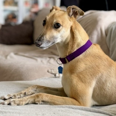 She currently lives with two other female greyhounds who she gets along well with.