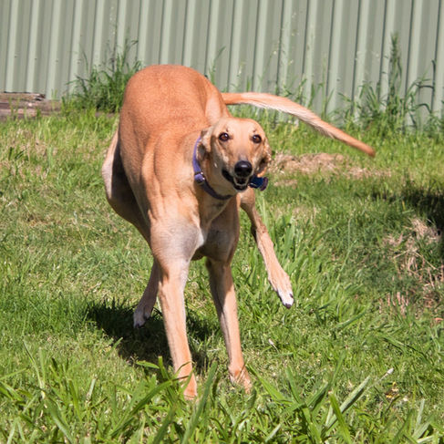 Sarah is a young, highly affectionate fawn girl that just loves a cuddle! She is comfortable around people and other greyhounds, but is also more than happy to be left at home on her own for long periods of time. She is currently fostered with a full-time worker. She loves toys (squeaky ones are her favourite!) and will happily throw them around all by herself. She will also collect all her toys (and sometimes other items too!) in her spot in the backyard or inside the house.